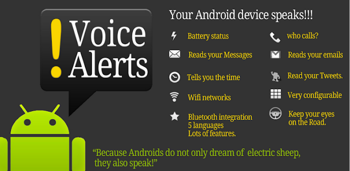 VoiceAlerts es una aplicación para la plataforma móvil Android, su objetivo es alertar al usuario con mensajes de voz cuando ocurren los siguientes eventos: